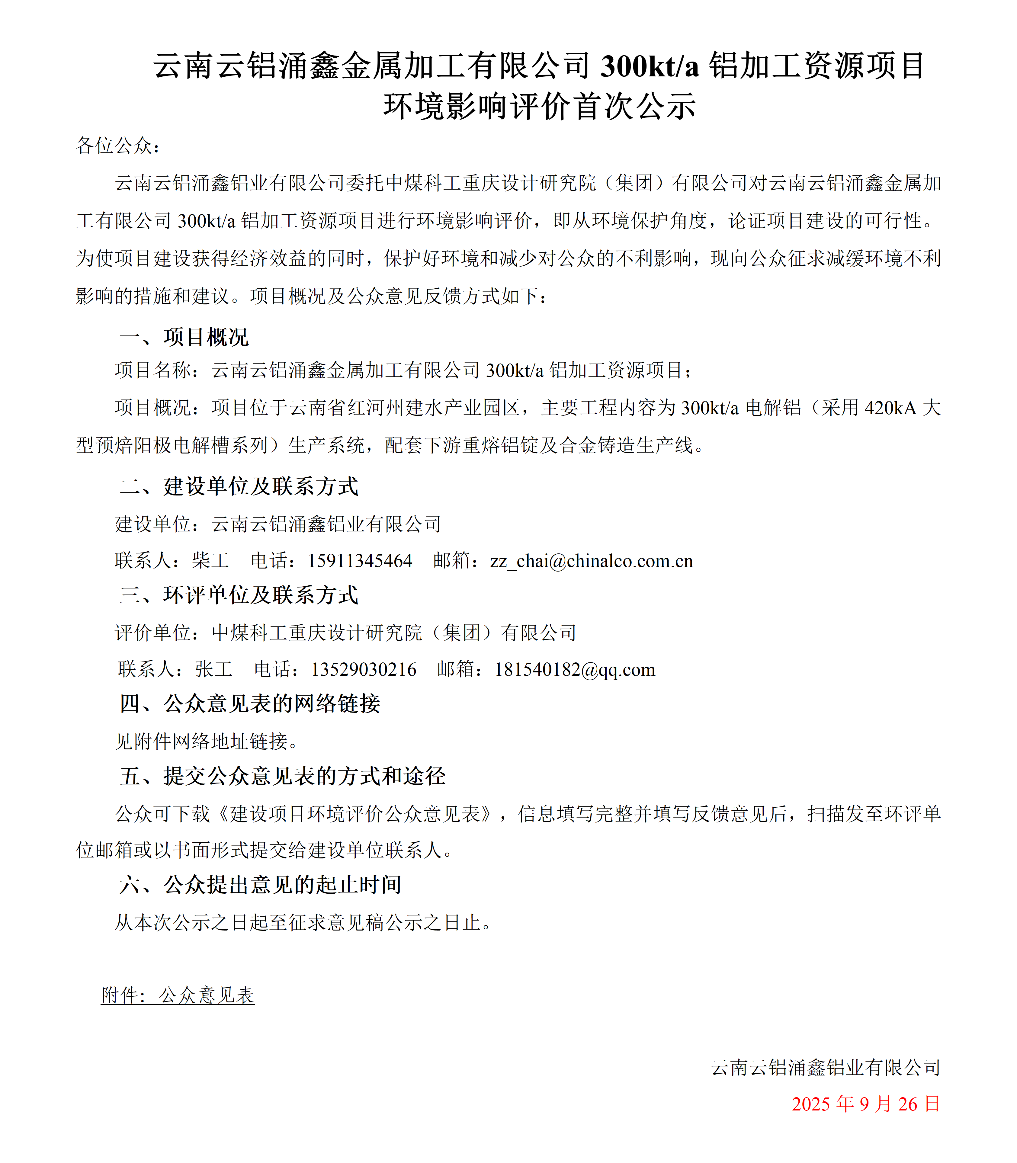 云南云铝涌鑫金属加工有限公司300kt/a铝加工资源项目 环境影响评价首次公示