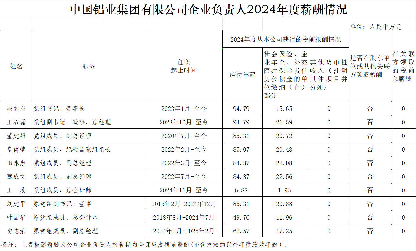 中国铝业集团有限公司企业负责人2024年度薪酬情况
