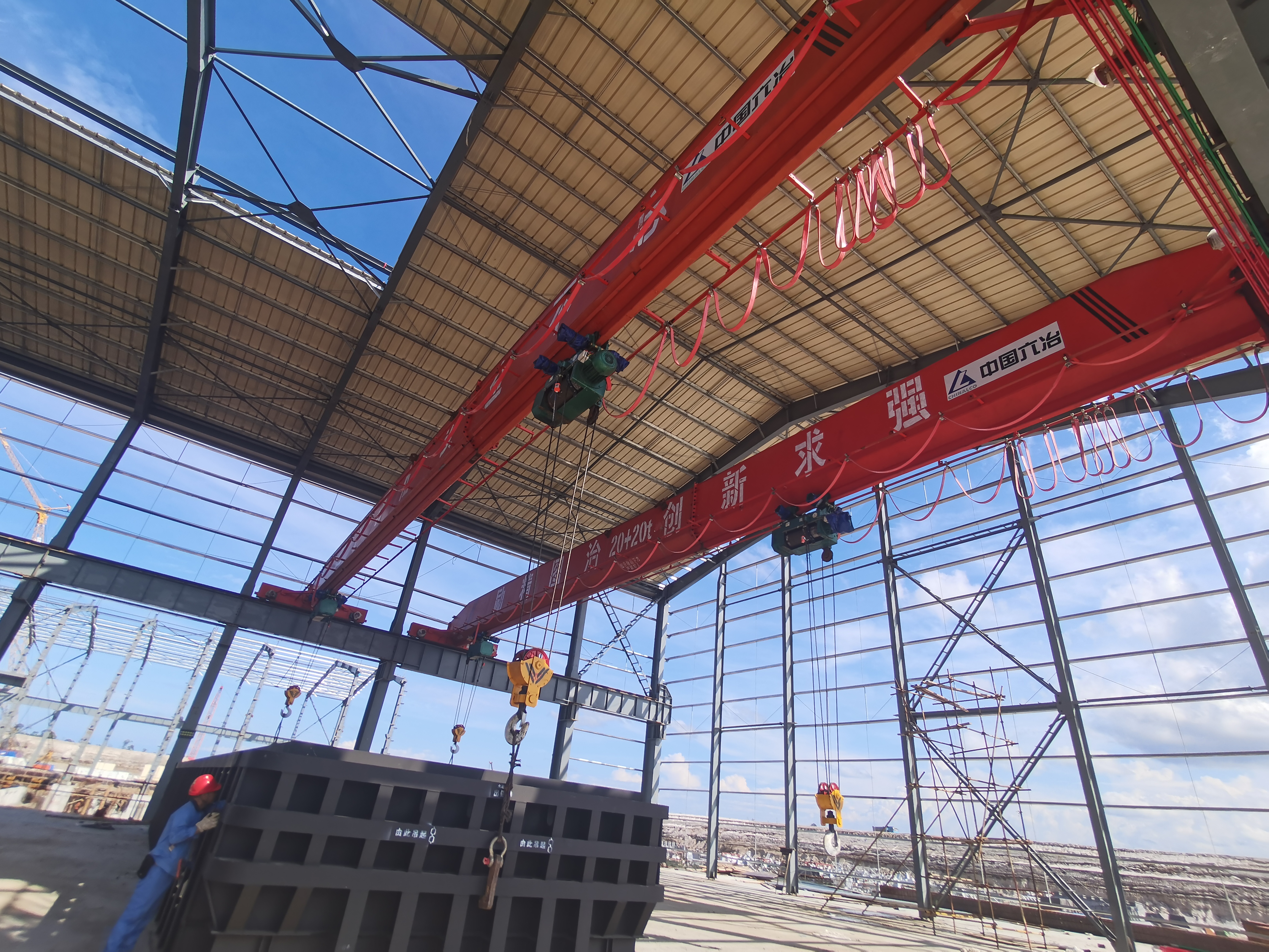 此次吊装的电解槽单台重量超50吨,体积庞大。为确保这些“钢铁巨无霸”安全、高效吊装到位,六冶项目施工团队提前修建了栈桥坡道及设备平台,确保重型运输车辆从港口码头到车间平台通行无阻;定制适配的单梁吊设备,多次进行设备性能测试与操作培训,通过沙盘推演、实景模拟等方式,反复打磨吊装流程细节,最终实现15台电解槽精准吊装就位,为后续安装工作提供了示范。