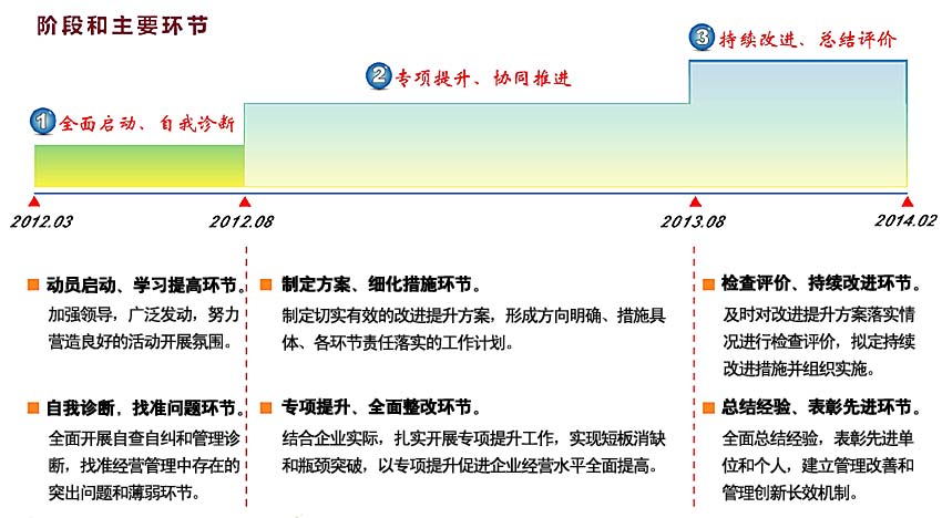 1、找准管理短板和瓶颈问题,实现重点突破。 2、强化向管理要效益理念,切实加强基础管理。 3、统筹推进专项提升,全面落实整改措施。 4、总结固化成果,构建长效机制。 |